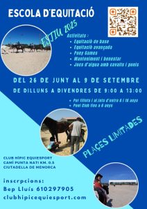 Al Club Hípic Equiesport fem escola d’estiu per nens de totes les edats, fins als 16 anys. Podran disfrutar d’activitats molt variades, aprendre a respectar i cuidar els cavalls, iniciar-se a la equitació, millorar la tècnica per als més avançat i jocs d’aigua amb cavalls l’estona de més calor del matí.